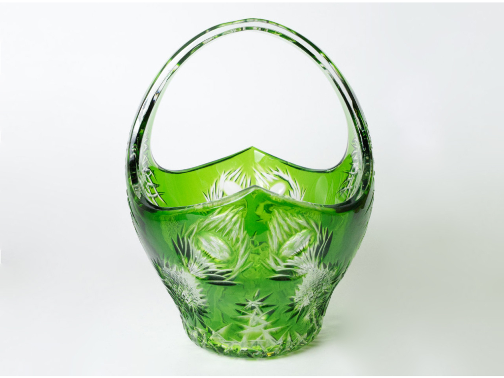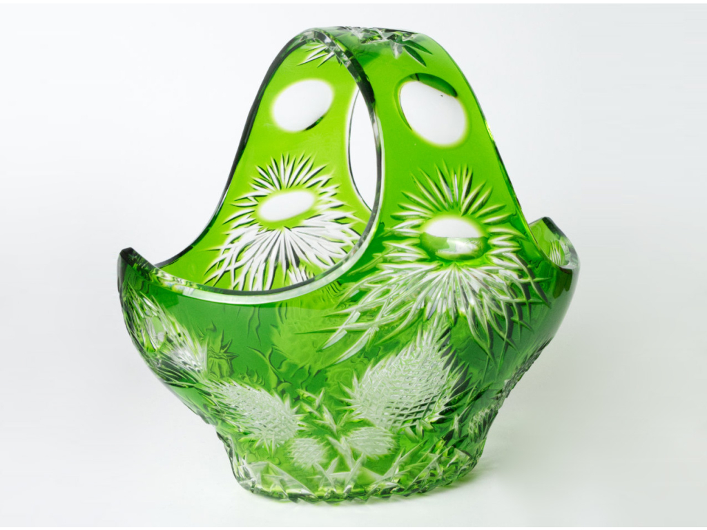 Ručně broušený koš zelený Bodlák je vyroben z tradičního přejímaného českého křišťálu a je dekorována bohatým brusem Bodlák. Vzhledem k použití několika odlišných technik brusů, jde o jeden z manuálně nejnáročnějších ručních dekorů. Přejímaný křišťál vzniká spojením dvou vrstev skla, čirého a barevného. Jde o náročnou sklářskou techniku, kterou v dnešní době zvládá už jen pár mistrů sklářů.